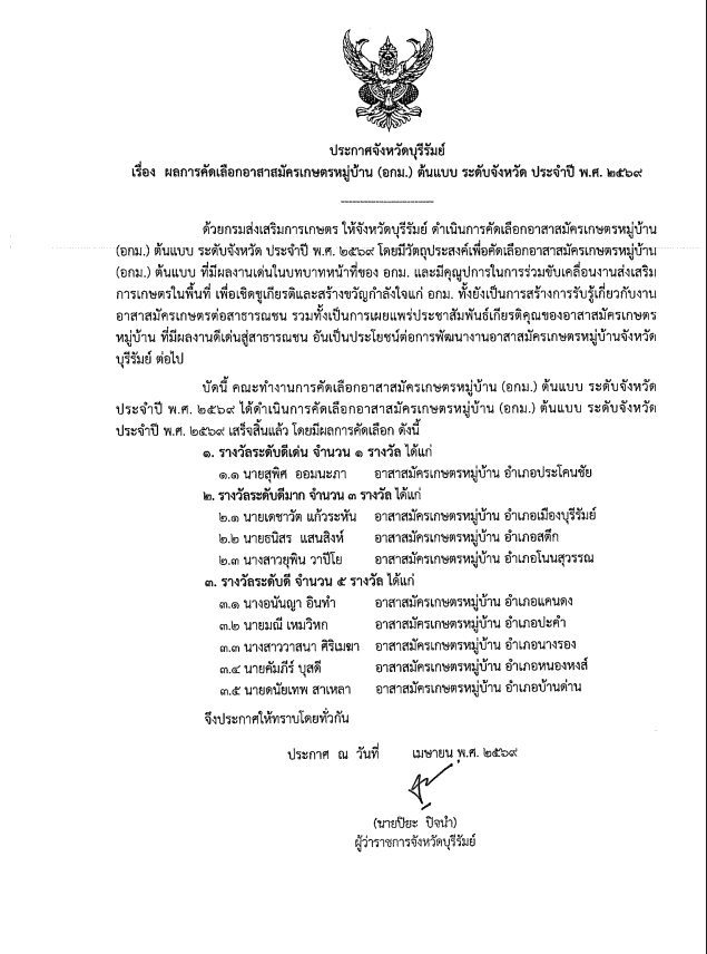 ประกาศเกษตรอำเภอ คัดเลือกอาสาสมัครเกษตรหมู่บ้านระดับจังหวัด 2569